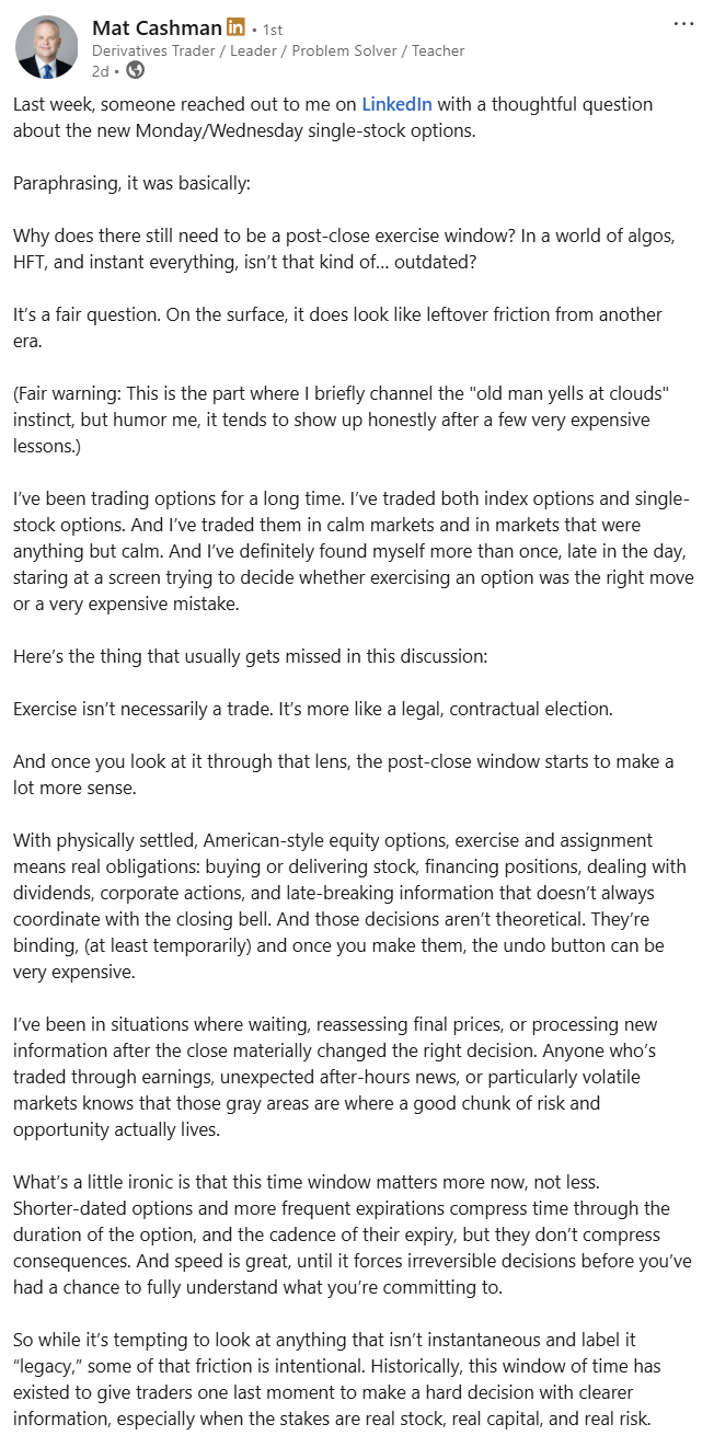 I’ll wrap up with this blurb from my friend Mat. I found it interesting because I have sometimes thought that it’s a historical accident that the most popular options are American-style vanillas when you can see how cash-settled European or even Asian-style options would make more sense.