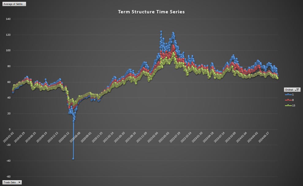 A basic infrastructure starts with the futures chain and term structure. While I don’t currently have a proper infra I did grab several years of simple end-of-day WTI futures prices prompted by my oil trade idea.