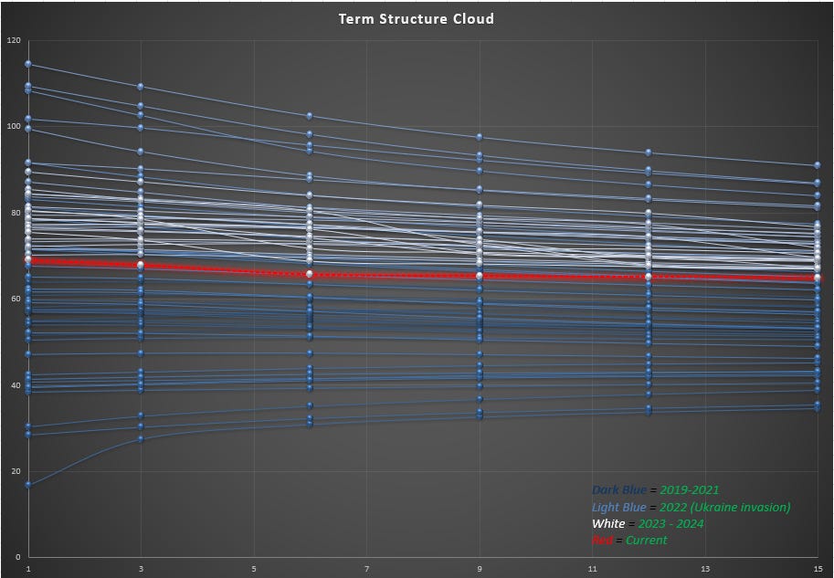 You can also see how for the past 5 years, the oil price has been backwardated (descending term structure) whenever the prompt price has been at least $45. I didn’t load the data from the 2010s but the last few years have been regime. Perhaps reflecting the idea that oil-demand in the future is uncertain with the focus on alternative fuels. (Personally I keep my core oil length in the deferred futures incentivized by an implied positive roll return and because the mandate also comes with a lowered incentive to invest in supply. In other words, vibes. I don’t know anything about the future but energy is part of my asset allocation. Hedgers sell the back so that’s where there should be a compensation for providing liquidity which manifests in a roll return. If I have to pick a spot on the curve to fill that bucket, that’s where I’m going.)