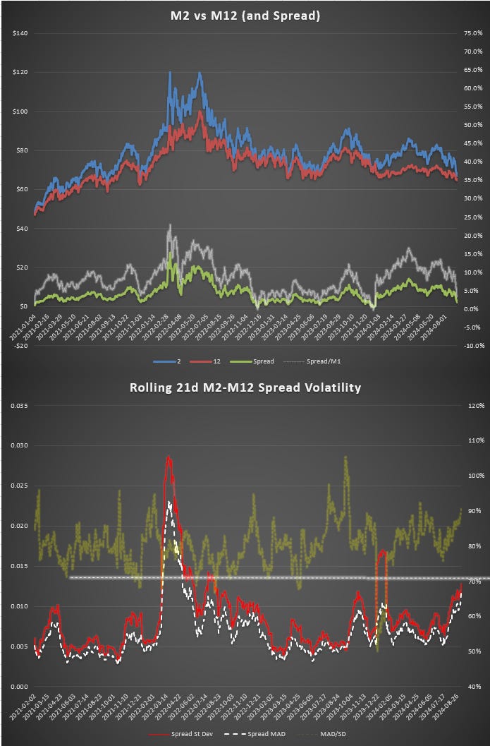 If the spread volatility is high, meaning the realized vol ratio of M12 to M2 is low, then if you are long time spreads you are going to be short options on the thing that moving a lot, and long options on the thing that’s lagging. You want to make sure you are getting the appropriate vol discount to hold that! Measuring what that is will get you to a proper understanding of the vol term structure and implied forward vol.