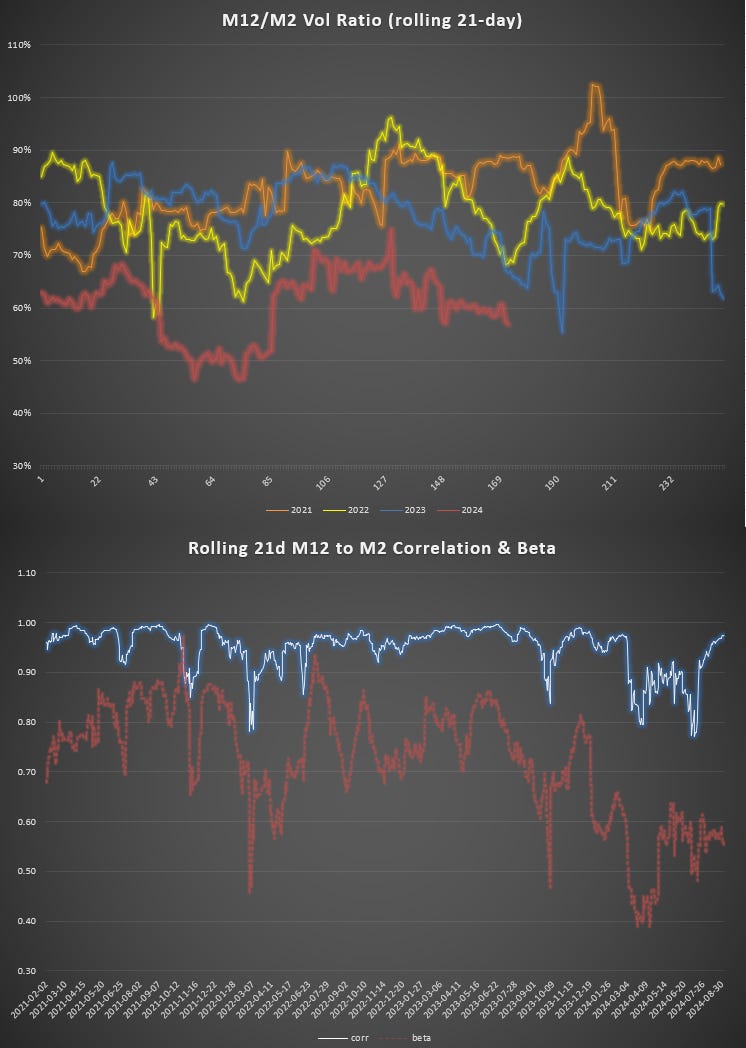 Notice that the high spread delta of 2024 corresponds to a low M12/M2 vol ratio.