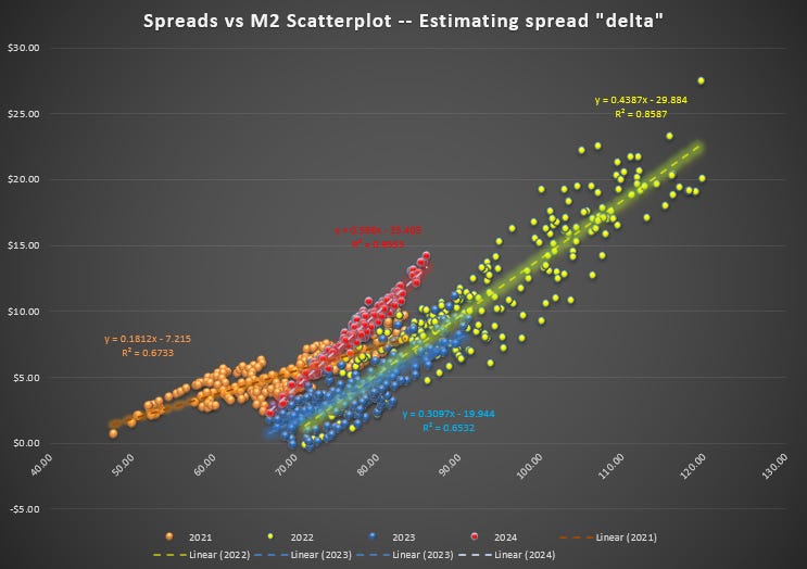 The slope of the regression tells us the “spread delta”. For example in 2022 (yellow), a $1 change in M2, meant a $.44 change in the spread.