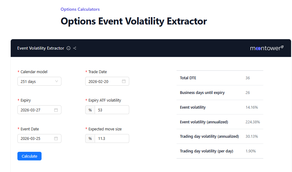 You already know to use the free event volatility extractor to compute trading day volatility by removing an expected earnings move from an expiration. Let’s use the calculator in reverse. If we assume a typical trading day volatility of 30%, then if we were certain a strike were to occur, we guess-and-test our way to an 11.3% move size to make the term vol fair at 53%