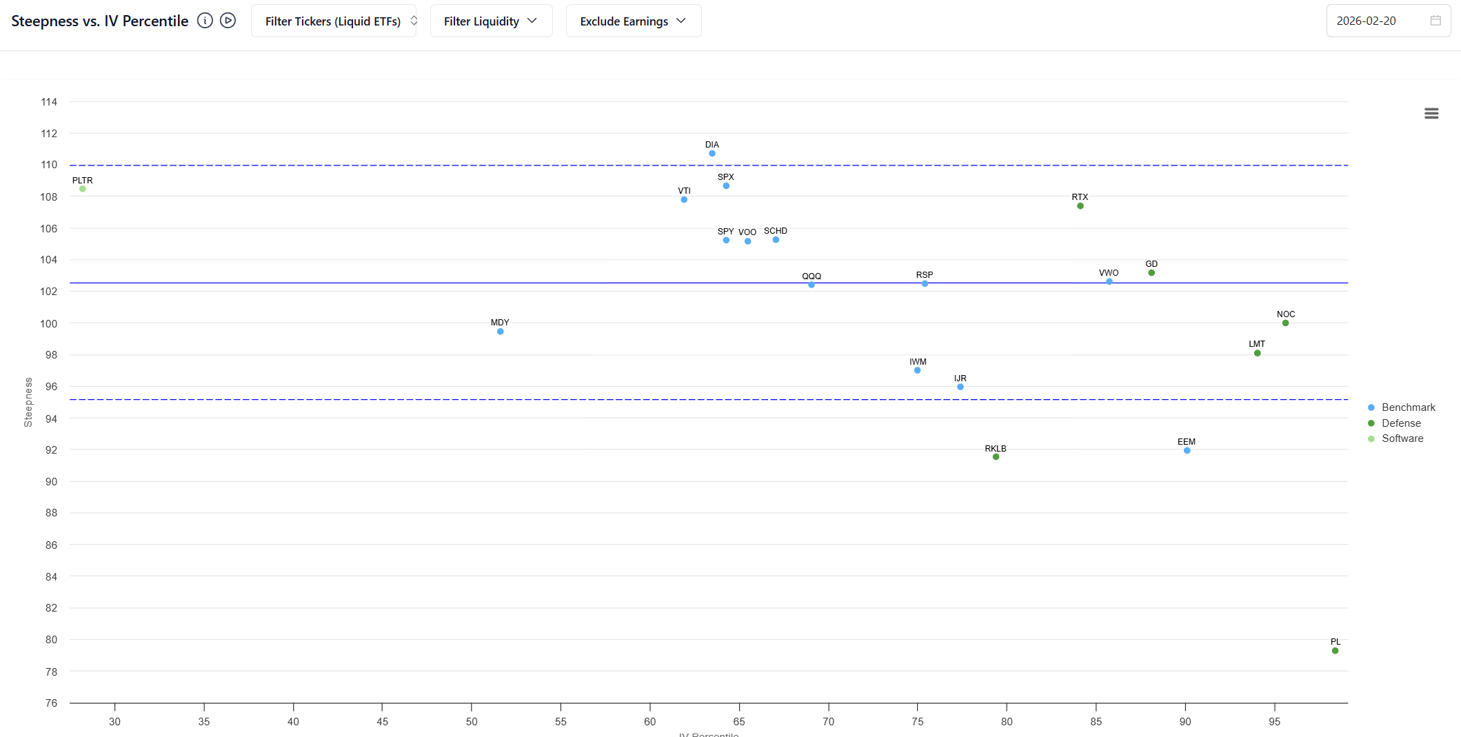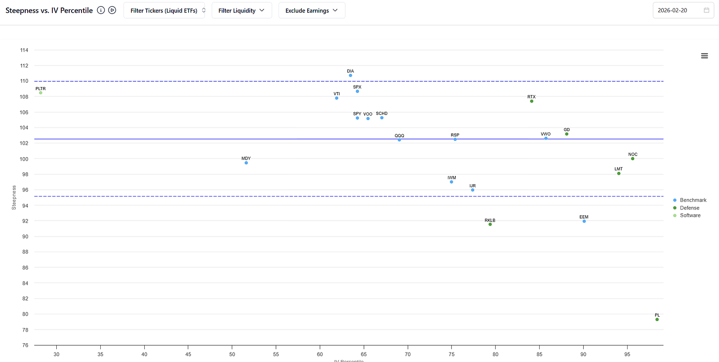 The volatility risk premium across many liquid markets isn’t abnormal. The market either doesn’t care what oil and Polymarket says or a strike on Iran is not expected to have a material effect on the volatility of equity shares. However, defense names have implied vols in high percentiles (while PLTR vols are tanked btw)