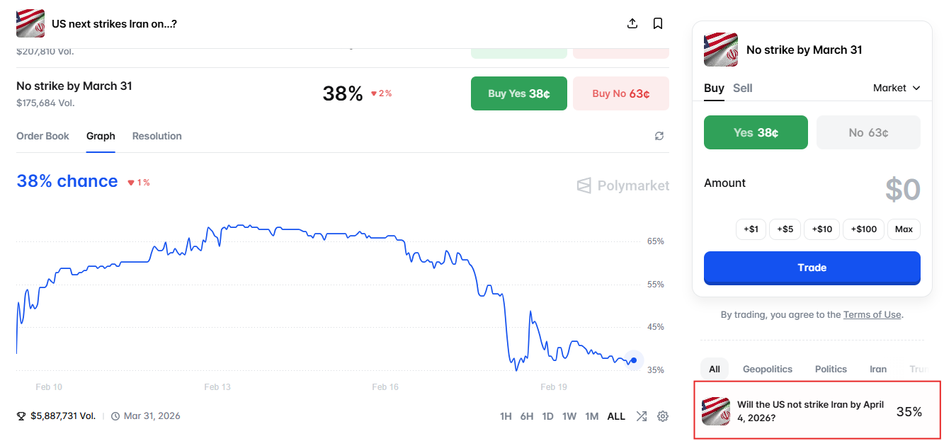 Polymarket implies only 38% chance that the U.S. does NOT strike Iran by March 31.