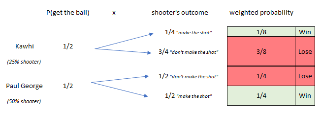 So Paul George took the shot 2/3 of the time. Going into that last play we expect he wins us the game 1/4 of the time (50% chance of getting the ball x 50% chance of making the shot) but once we “condition” the question on “The Clippers won”, the probability that he took the shot jumps to 2/3!