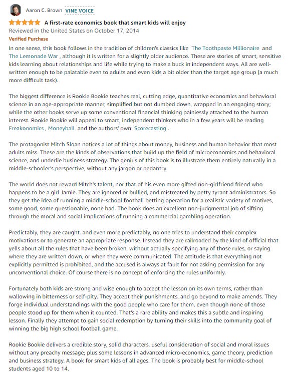 I’ll add a special mention for Rookie Bookie which I read with Zak this year. It’s written by a Wall Street quant with a sports analytics love. This observation from the book is a nice demonstration of how the book is fun for the adult reading with the kid: