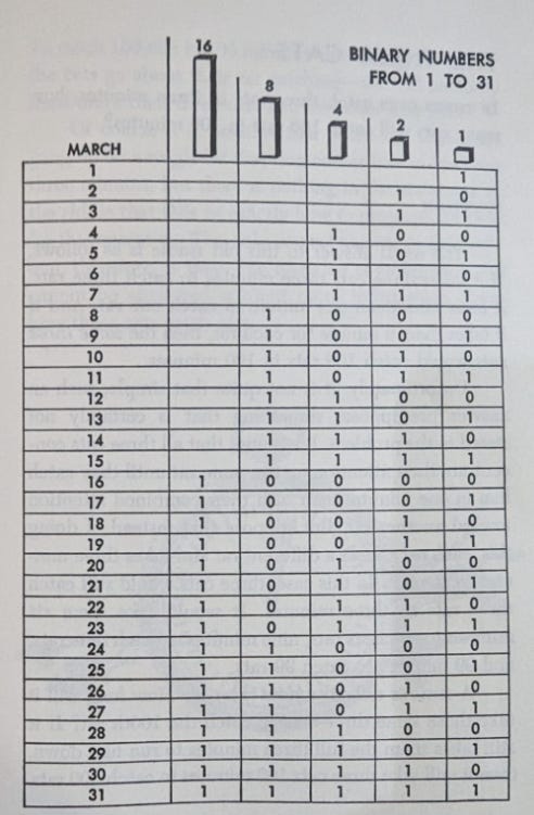 Despite teaching binary that afternoon, I did not recognize it was the key to answering the riddle! Zak was flabbergasted by the coincidence that the solution was in “what’s that word you keep saying…binary?” after he just learned it. Baader-Meinhoff on steroids. (It was really cute that he kept shaking his head about the coincidence that the thing he just learned showed up in a random problem I chose that night. The coincidence hit him just as hard, maybe even harder, than it did me.)