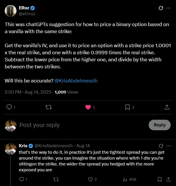 The vega of options gets small in near-dated options so...maintaining a sense of proportion if important. If the ATM vol is 20% and the skew is 10% (ie 22 vol) vs 15% (23 vol) and the vega is 0.005 you havenât even changed the value of the vertical spread by a cent even though the skew is 50% larger. I have written about this âsense of proportionâ stuff. People get caught up in metrics that when you translate back into price space matter on the order of âitâs like paying an extra commission charge to IB on the tradeâ. In other words, if the difference changed your decision to trade, then the rest of your infra better be medical grade accuracy bc you're trading for slivers.
