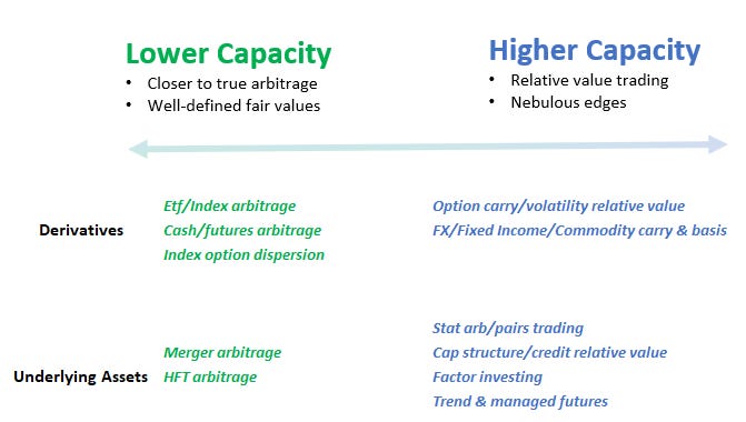 The diagram above serves as a handy taxonomy. A snapshot to understand where a strategy lies on the continuum of arbitrage, scalability, and clarity of fair value.