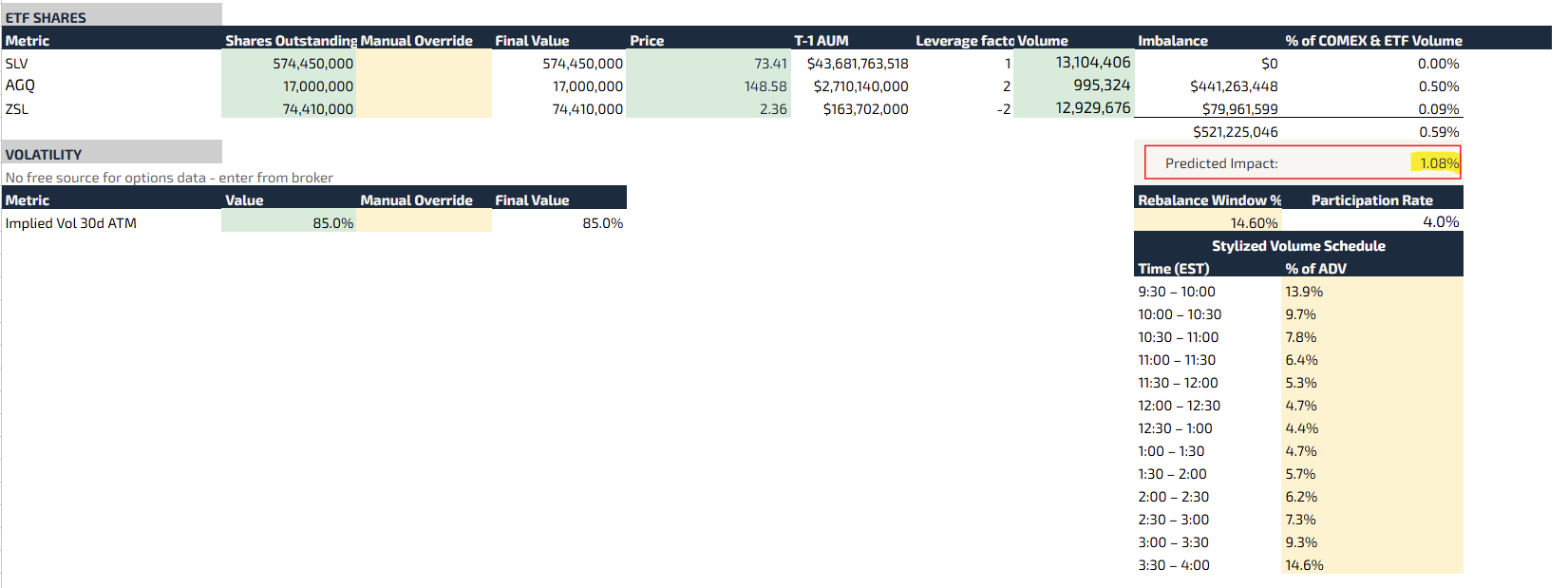 In levered silver flows, I showed how to compute the market imbalance. If we make an assumption about what percentage of the day’s volume will trade in the period of the rebalance, we can estimate a market impact.