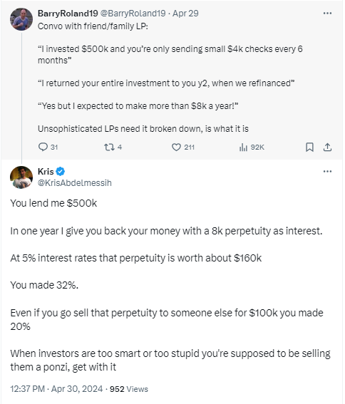 If you have ever been asked to invest in a real estate syndicate or restaurant and found the proposition a bit strange to understand, the below tweet and response might be helpful. Pardon my snark at the end.