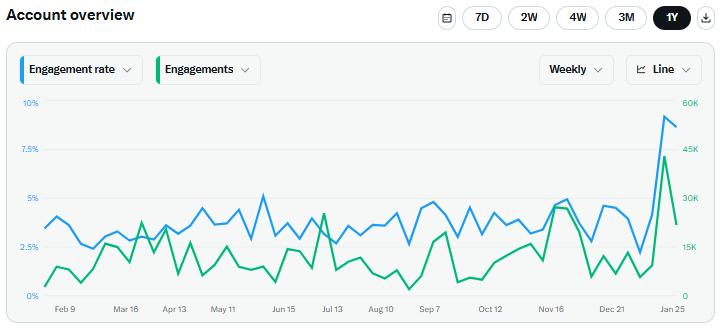 * A lot of people (and bots) are boosting these. I am treating these releases as a spaced repetition exercise for long-time readers. Analytics show very high engagement so X must be signal-boosting them. This is a 1-year chart. The recent spike is Articles:A lot of people cry about the growth of Articles longform on X but twitter is a long way from the community it used to be anyway, so don’t really care as much if I’m burning the house for warmth in the eyes of diehards. Although I don’t think I am since the reason I came to twitter in the first place was to find stuff to read and learn not hot takes. It's different things to different people and when they suppressed Substack it shifted the appeal for me. This is some re-alignment, albeit on their terms. Fine. It's a reasonable negotiation. The Articles I’ve posted on the theme of non-linearity in options