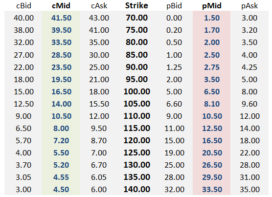 We begin with an invented option chain for our fake stock. I chose these values to be in keeping with the quality of the real stock’s markets without giving anything away.