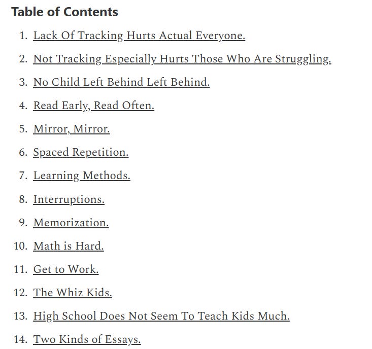 Let me pause here for a moment to remind you that my guide The Principles Of Learning Fast distilled from The Math Academy Way is not a controversial reading of the learning literature, or to be more accurate, the literature on “skill development”. The same principles that we use for athletics work in academics. But all of this knowledge is heavily ignored for (waves hand) “reasons”.